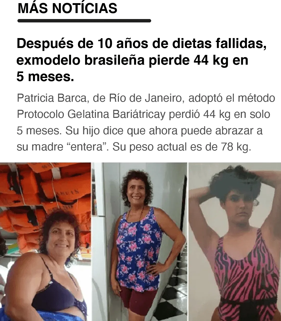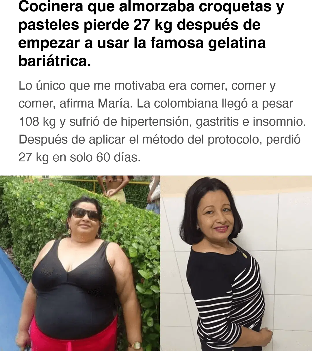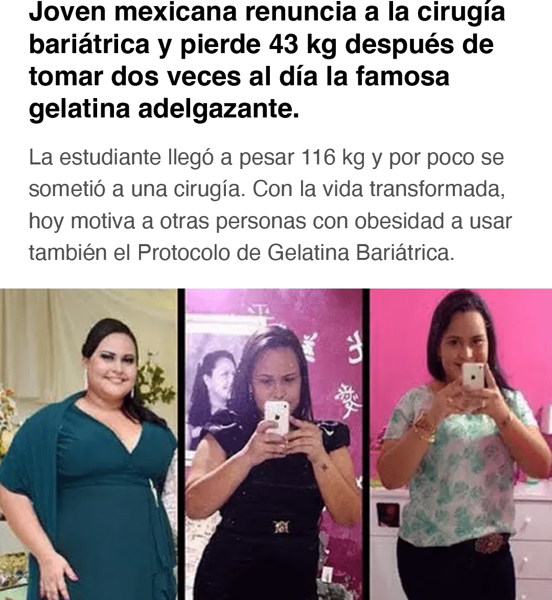 "Ya había intentado de todo para adelgazar, pero nada funcionaba. Después de incluir la fórmula de la Gelatina Bariátrica en mi rutina, perdí 11 kg en solo 3 semanas sin cambiar nada en mi alimentación. Ahora me siento más segura y llena de energía. ¡Este Protocolo cambió mi vida!"